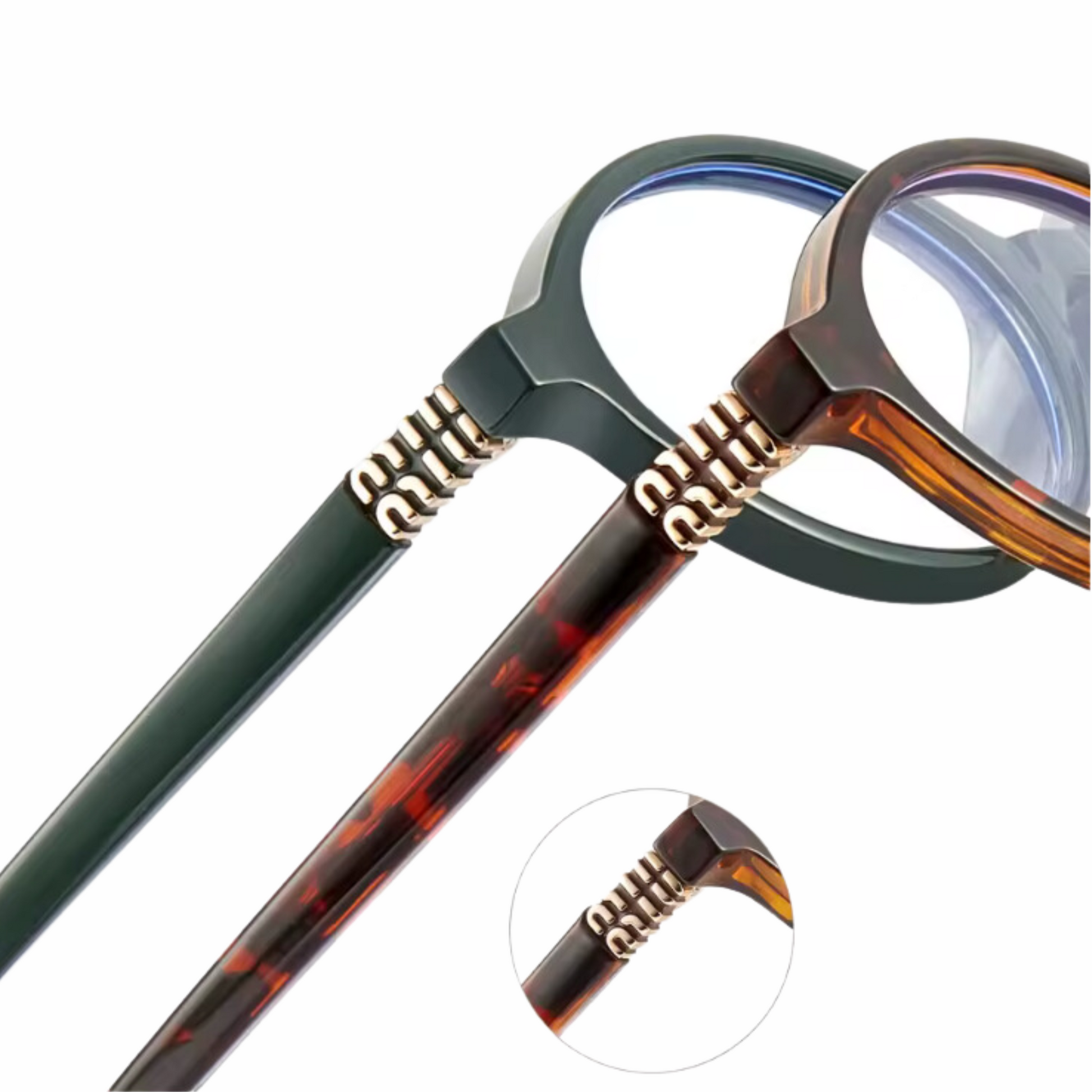 Channel effortless glamour with the Miu Miu Serenity Luxe Frames, blending contemporary sophistication with a dash of couture. Featuring a chic oval design in tortoiseshell and deep forest green, these glasses exude a refined aesthetic reminiscent of high-fashion allure. The wide-edge silhouette is adorned with subtle golden accents, capturing Miu Miu’s signature luxe detailing. With UV 420 protection and anti-blue light technology, these frames combine style with practicality, making them your go-to accessory for a polished, everyday look.